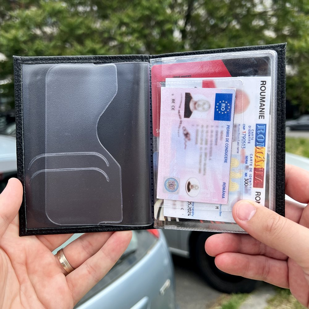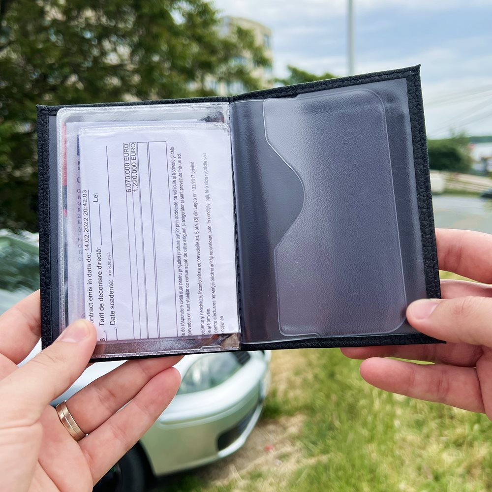 · Compartimente: carduri, acte de identitate, acte auto – inclusiv un copartiment pliabil A5 pentru asigurarea auto. Atentie: Acest produs nu contine compartiment pentru bani