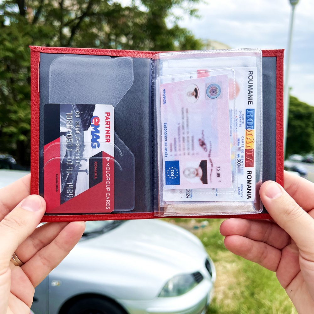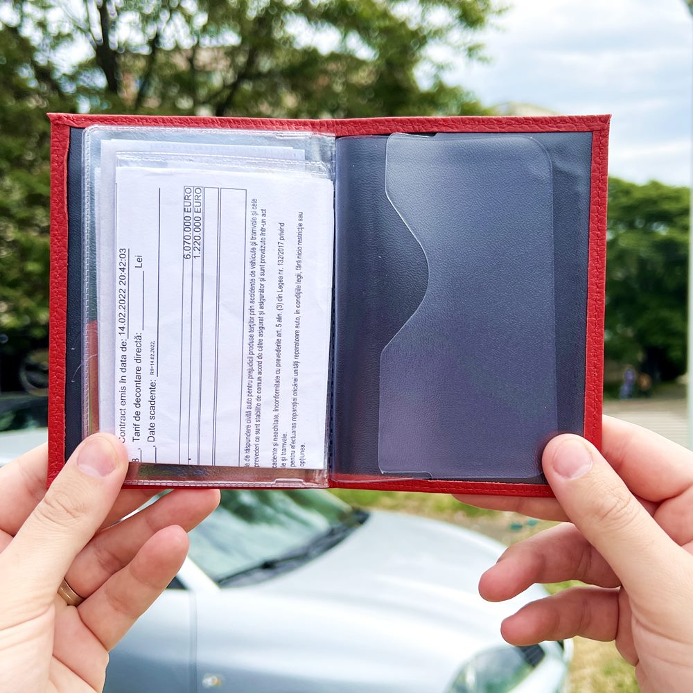 • Compartimente: carduri, acte de identitate, acte auto – inclusiv un copartiment pliabil A5 pentru asigurarea auto. Atentie: Acest produs nu contine compartiment pentru bani